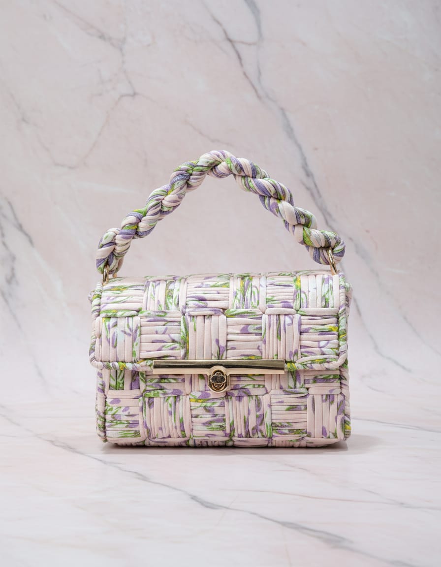Combining traditional artisanal techniques with a modern silhouette, this bag features a delicate botanical print  in soft lavender and sage green tones, woven into a creamy, textured base. Whether you’re heading to a garden wedding and weekend brunch, this piece adds a touch of romantic sophistication to any ensemble.